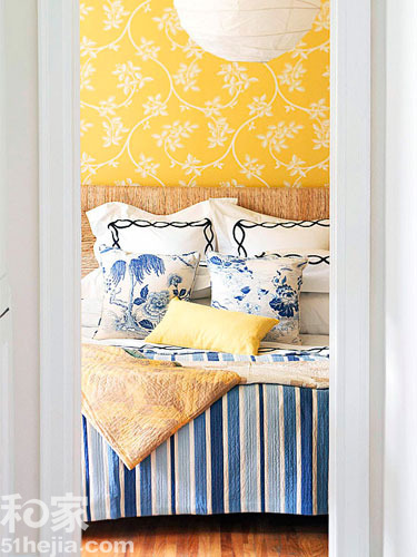 明黄色的花色图案壁纸,让感觉非常耀目,有效缓解了空间的单调感。给空间以明确主题,而且带给空间随时变化的风格。搭配简约的床具、蓝色的床品,让此卧室如同明媚的夏激活无限热力。5Jv易佰装饰网 100装饰-泰州装饰网 泰州装饰行业门户网站[泰州装饰招标/泰州装潢效果图/泰州样板房/泰州装修公司]