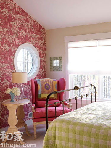 黄色和粉色的互补色搭配,桃红色印花墙面和黄绿色的床品,形成一种极具设计感的对撞搭配,既不过分华丽,也不过分朴素。5Jv易佰装饰网 100装饰-泰州装饰网 泰州装饰行业门户网站[泰州装饰招标/泰州装潢效果图/泰州样板房/泰州装修公司]